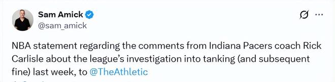 随后,NBA发言人向The Athletic记者阿米克发表声明,反驳卡莱尔对步行者调查过程的描述。