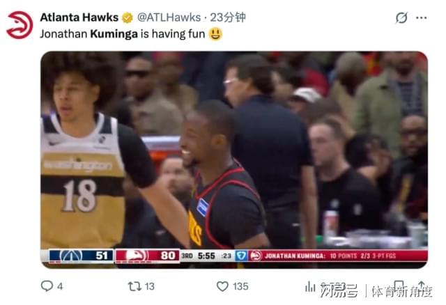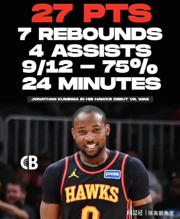 全场24分钟轰下27分7板4助2断,75%的命中率亮瞎眼!更绝的是,这孩子从第一球开始就咧着大白牙傻笑,活像中了彩票的二哈勇士那会儿,库明加最高分才25分,还"你们逼我上班"的苦瓜脸。如今在老鹰,这笑容比亚特兰大的阳光还灿烂,连场边卖热狗的大叔都打趣:"这小子怕不是把快乐基因注射到篮球里了!"