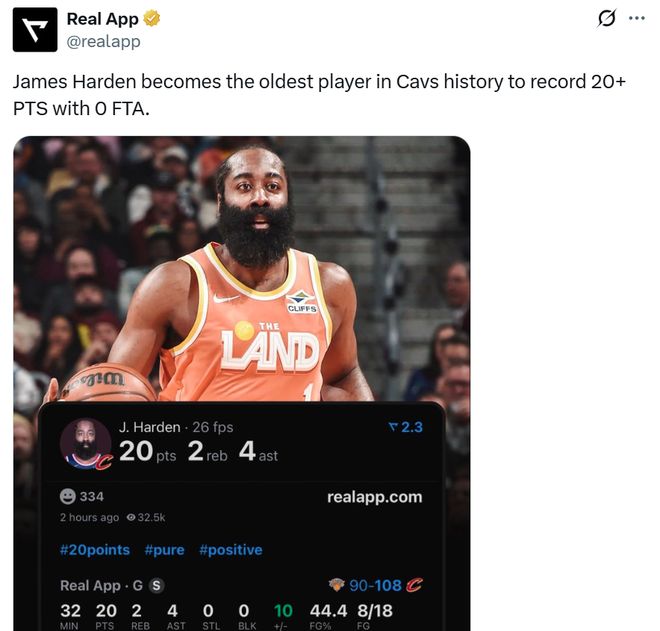 凭借这样的表现,36岁零183天的哈登成为骑士队史上单场0罚球情况下砍下20+最老的球员。
