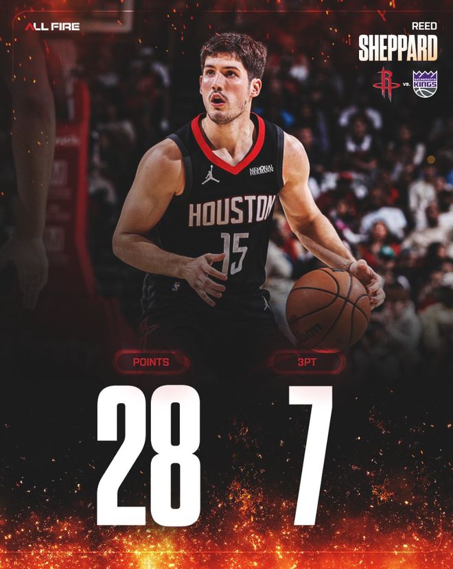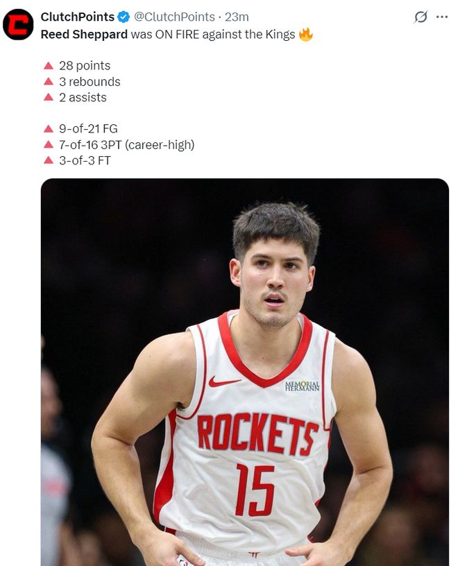 这场比赛里德-谢泼德的发挥很好尤其是上半场,他首节三分4中2拿到8分1篮板1助攻1盖帽,次节三分7中4拿到12分1篮板1抢断,整个上半场他就已经命中6个三分球拿到20分。