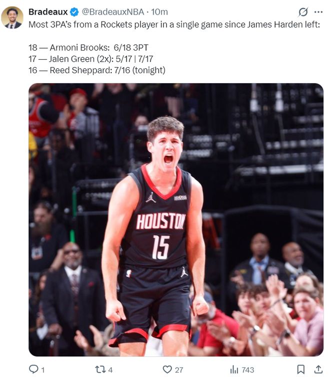 28+7三分创4纪录哈登后首人!谢泼德先发又炸裂 休媒却炮轰火管