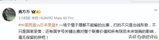 赛前,北京记者勇方方发文点评:“中国男篮vs日本男篮,一场于情于理都不能输的比赛,打的不只是出线形势,不只是国家荣誉,还有国字号关键比赛对整个联赛价值和所有球员未来饭碗的影响,毫无保留的拼吧! ”