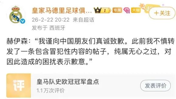 2月22日,皇家马德里足球俱乐部官方微博发布道歉声明,转述豪森的回应,称此事“纯属无心之过”。豪森表示:“我谨向中国朋友们真诚致歉。此前我不慎转发了一条包含冒犯性内容的帖子,纯属无心之过,对因此造成的困扰表示歉意。”