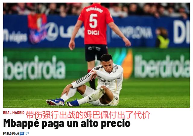皇马1-2负于奥萨苏纳的西甲之战,姆巴佩踢满90分钟未能建功。2月23日,《马卡报》透露,过去2-3个月,姆巴佩一直带伤强行出战。为了更多的进球,为了追赶C罗的纪录,姆巴佩不愿意停下来。