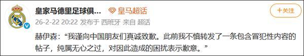 @皇家马德里足球俱乐部 2月22日在微博发布赫伊森的道歉内容,称“我谨向中国朋友们真诚致歉。此前我不慎转发了一条包含冒犯性内容的帖子,纯属无心之过,对因此造成的困扰表示歉意”。