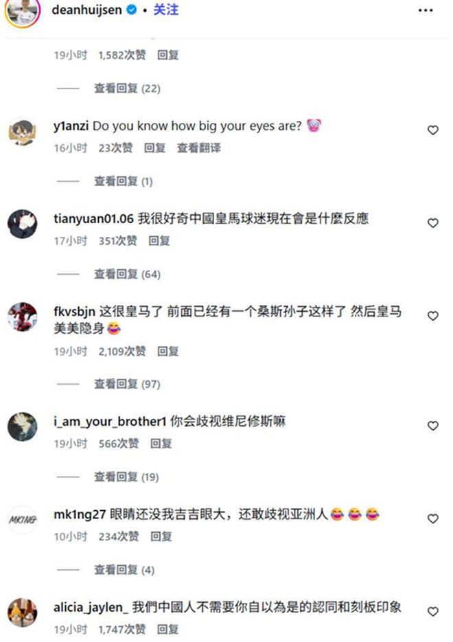 与此同时,海量中国球迷涌入赫伊森的社交账号,刷屏留言、严厉质问,大家用最直接的方式表达愤怒,要求赫伊森正视错误、公开道歉。