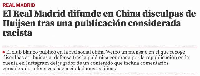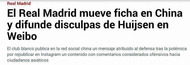 赫伊森在社交媒体转发辱华内容事件引发西班牙媒体关注,《阿斯报》《马卡报》《世界体育报》等西班牙多家知名媒体均对此事进行了报道。